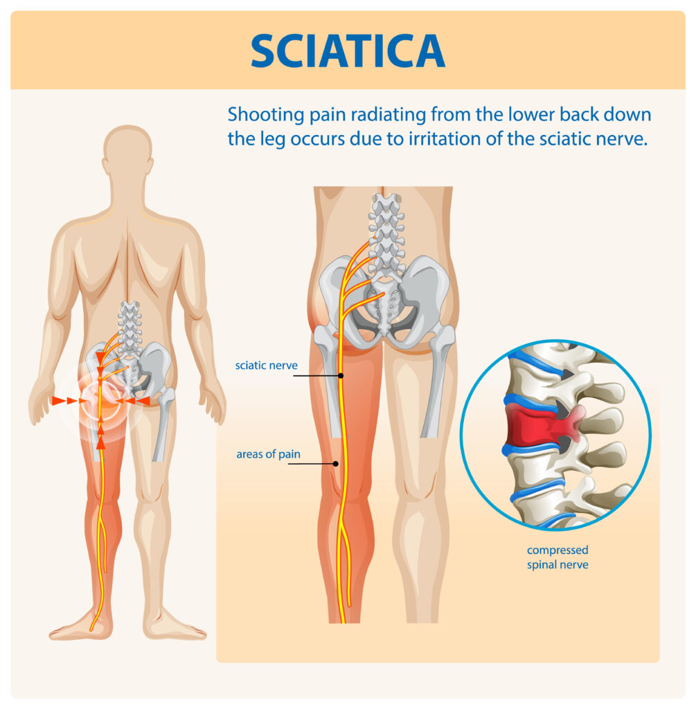 Sciatica refers to pain caused by irritation or compression of the sciatic nerve, the longest nerve in the human body. This nerve starts in the lower spine, passes through the hips and buttocks, and runs down each leg.